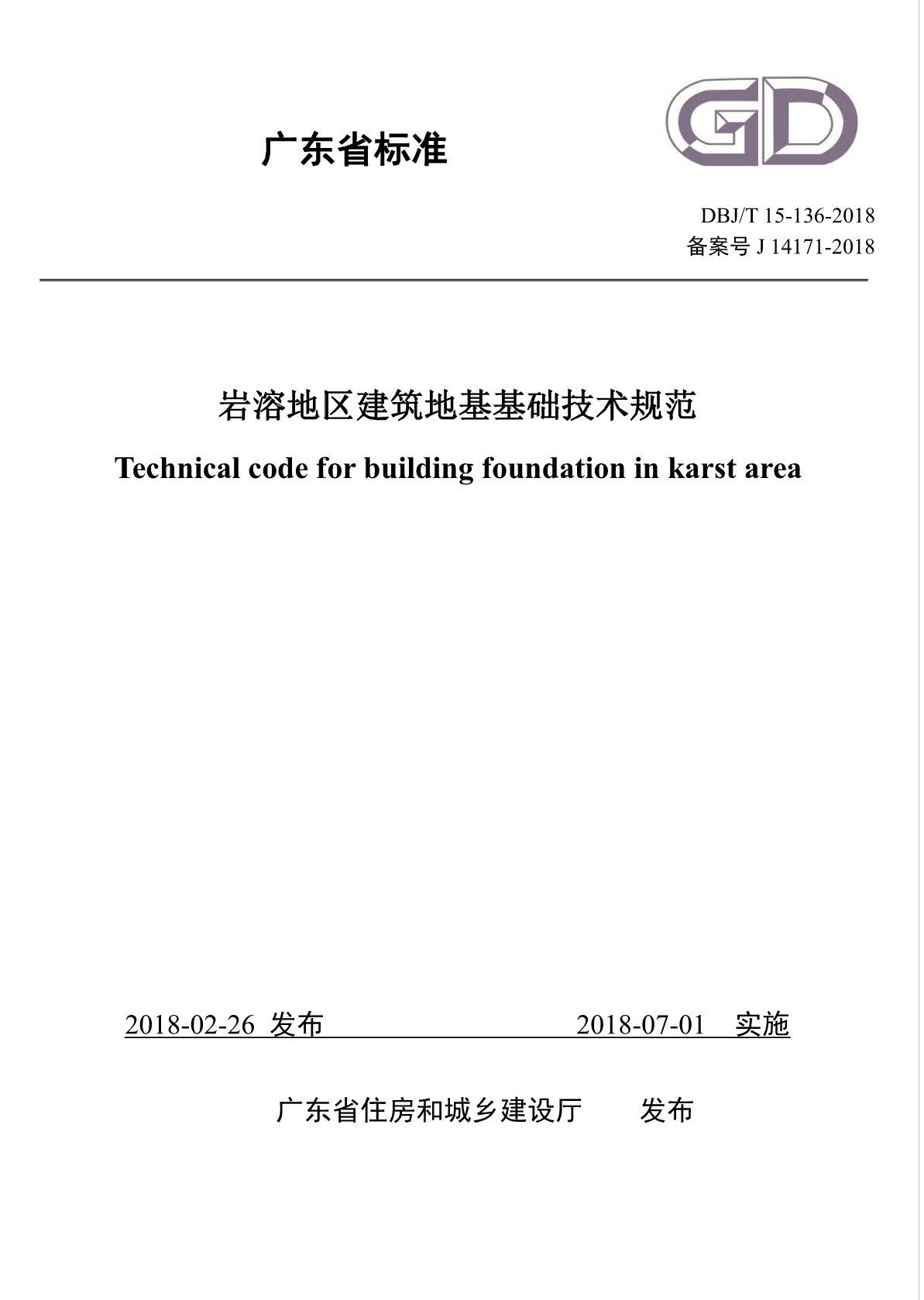订单名称:DBJ∕T15-136-2018岩溶地区建筑地基基础技术规范