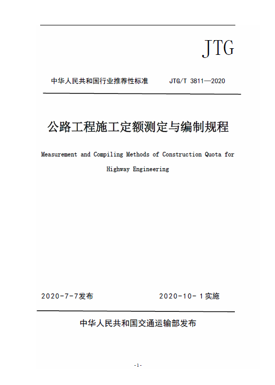 订单名称:JTG/T3811-2020公路工程施工定额测定与编制规程