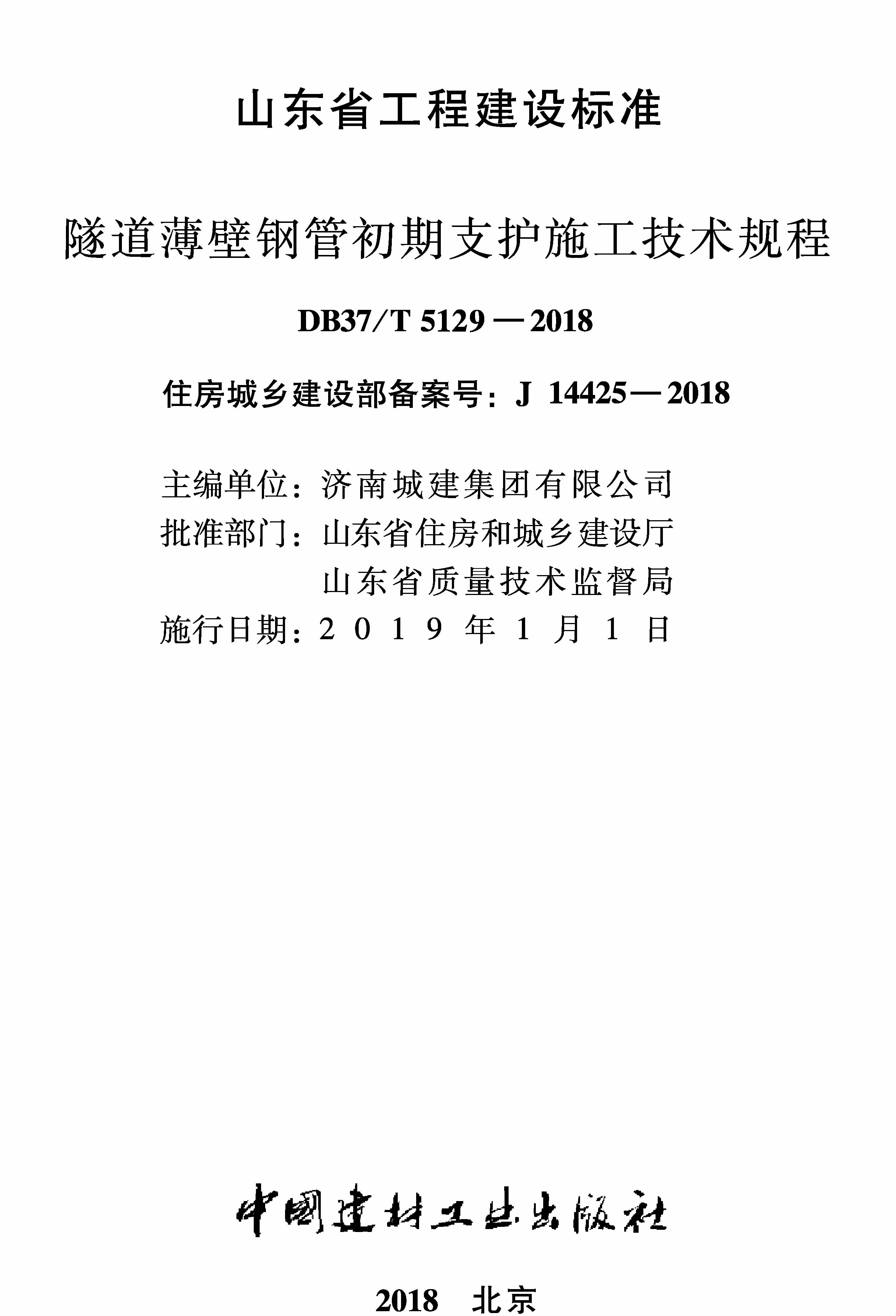 订单名称:DB37T_5129-2018_隧道薄壁钢管初期支护施工技术规程