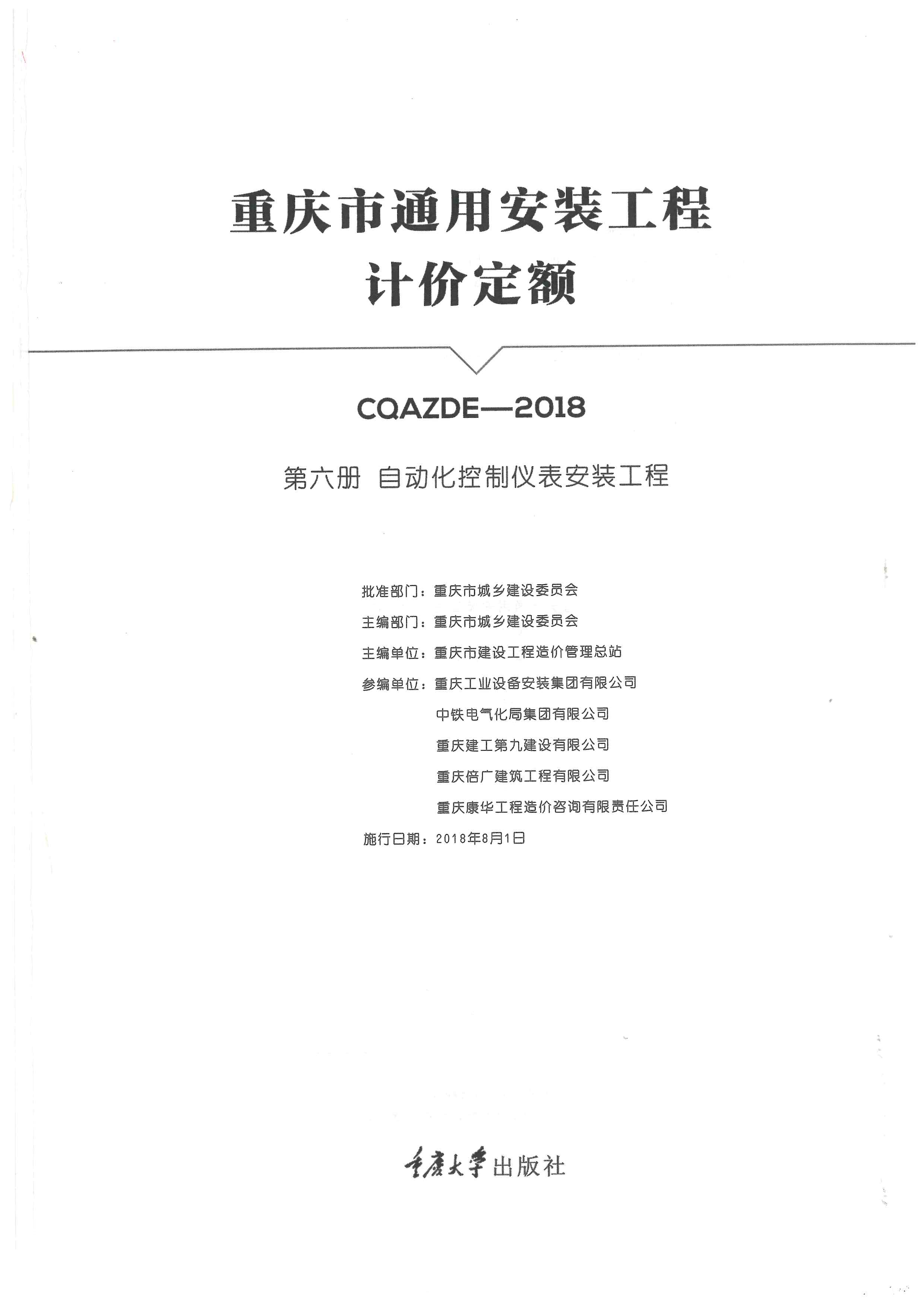订单名称:重庆市通用安装工程计价定额第六册自动化控制仪表安装工程2018年版