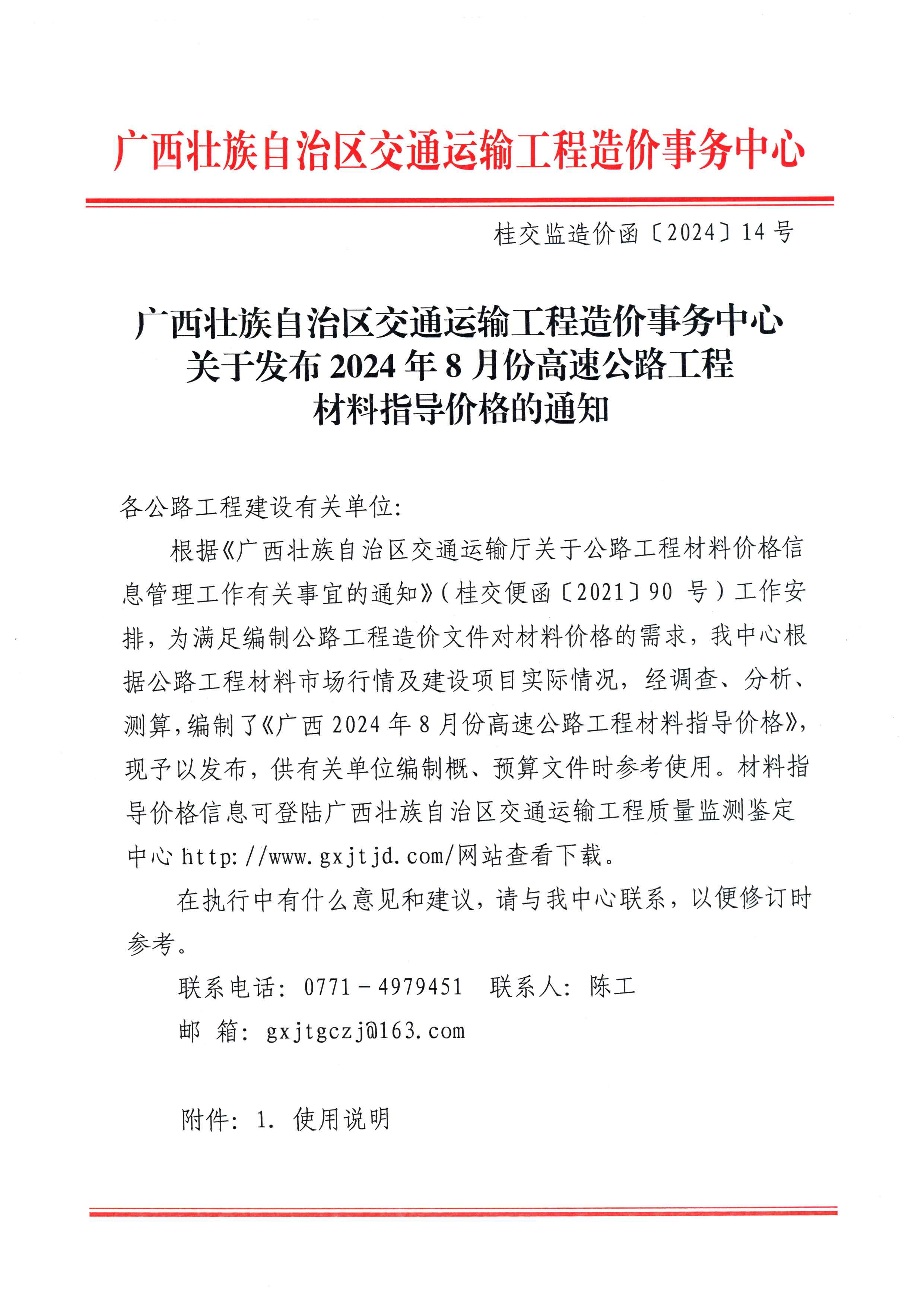 广西壮族自治区交通运输工程造价事务中心关于发布2024年8月份高速公路工程材料指导价格的通知