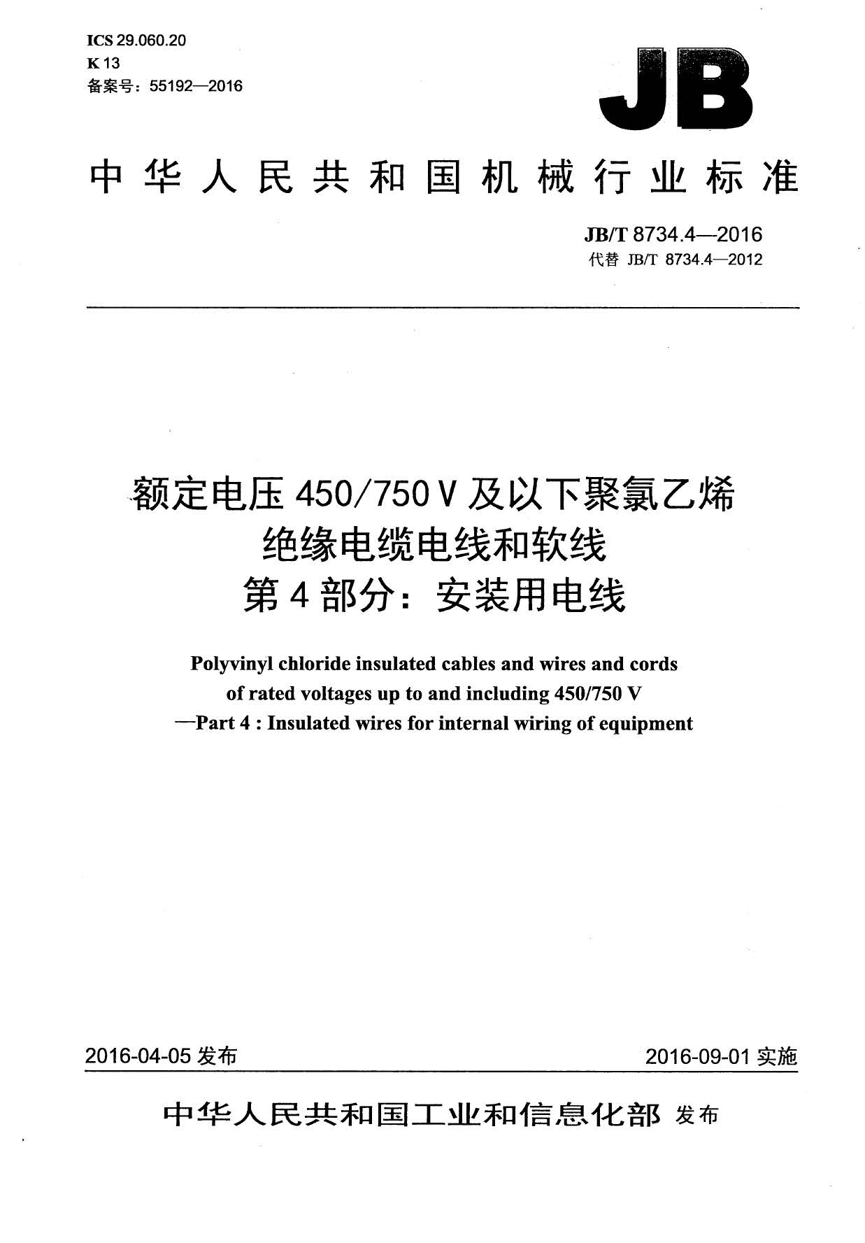 JBT8734.4-2016额定电压450/750V及以下聚氯乙烯绝缘电缆电线和软线第4部分:安装用电线