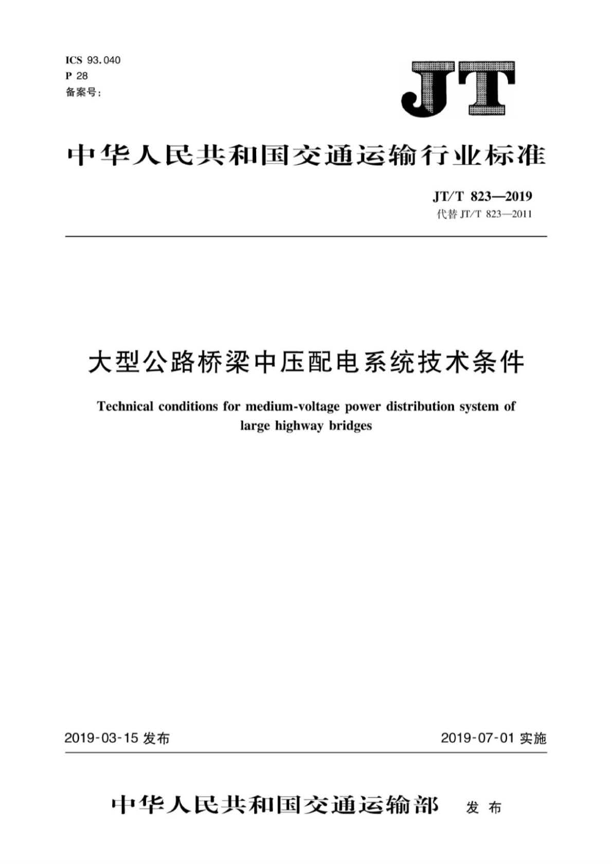 订单名称:JT∕T823-2019大型公路桥梁中压配电系统技术条件