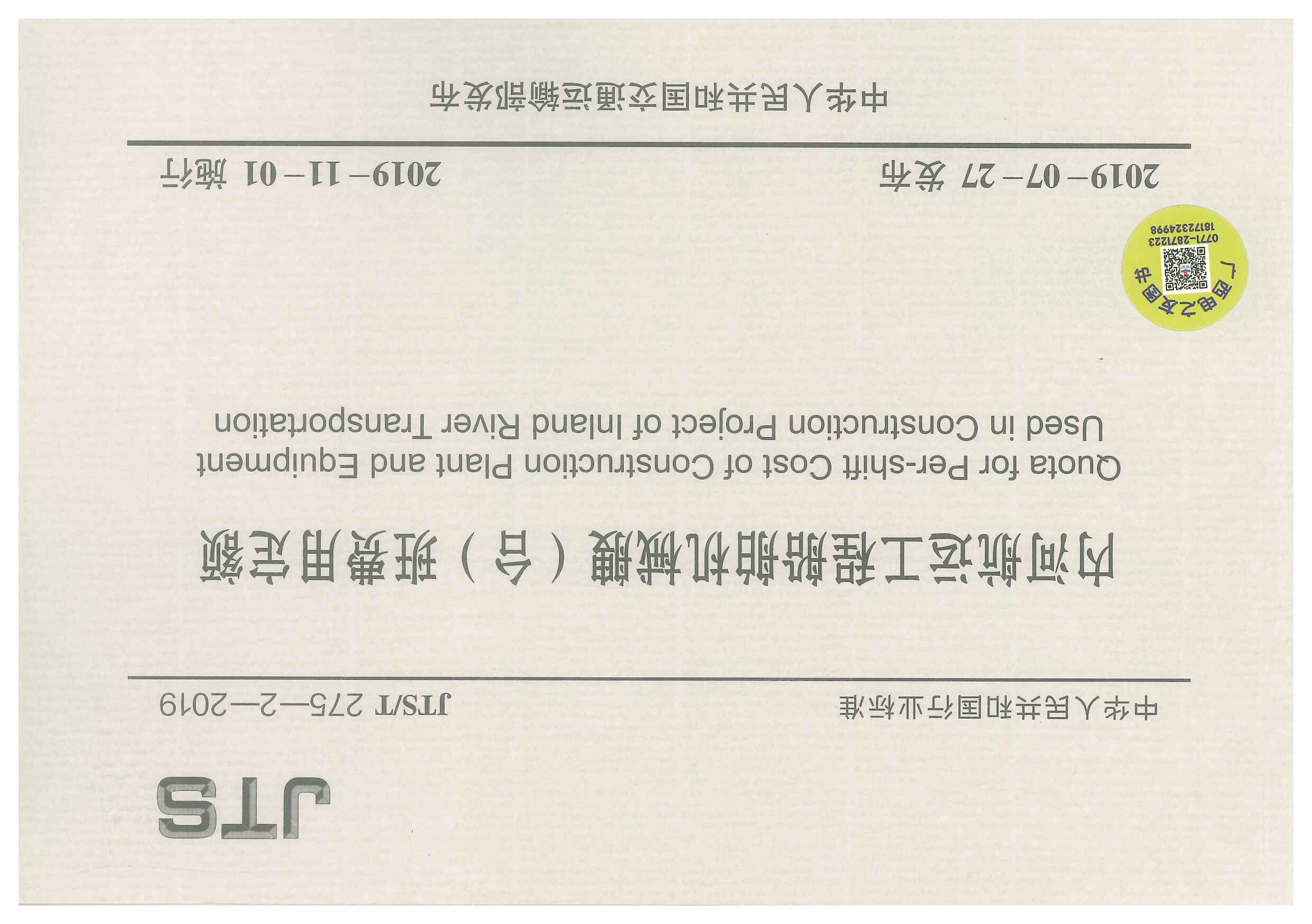 订单名称:内河航运工程船舶机械艘(台)班费用定额